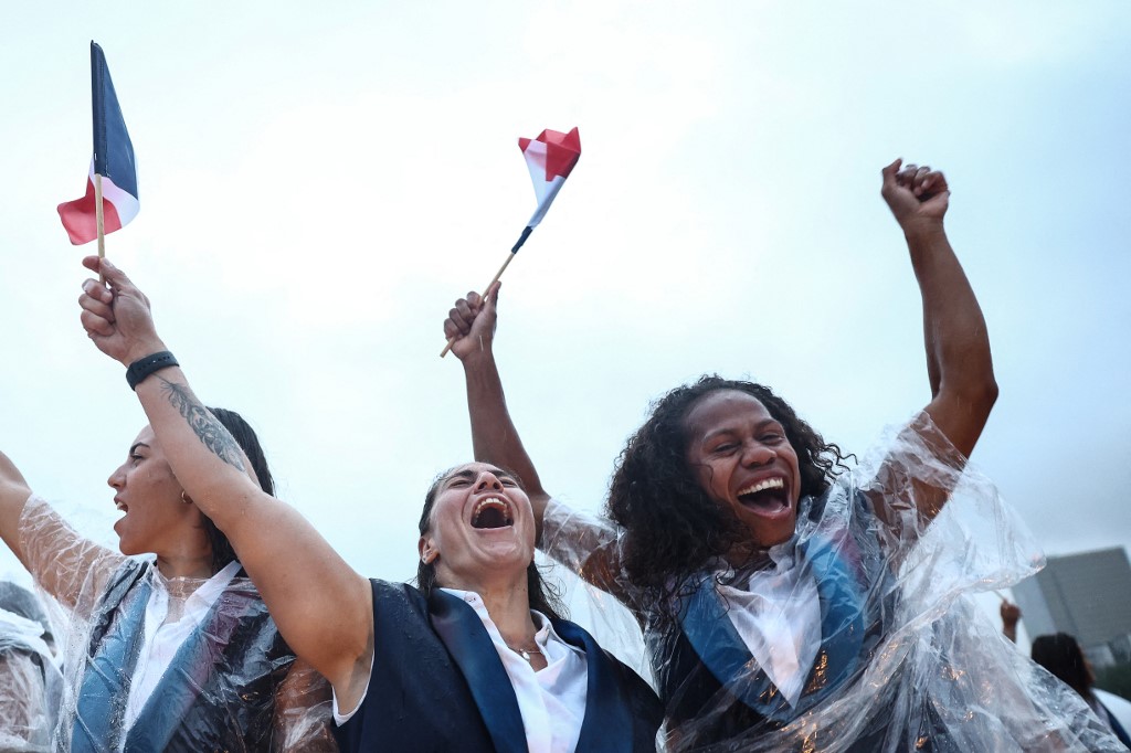 الرياضية الفرنسية يولان ينغو (يمين) وزملائها الرياضيين من الوفد الفرنسي أثناء إبحارهم على متن قارب على طول نهر السين خلال حفل افتتاح دورة الألعاب الأولمبية 2024 في باريس، 26 تموز/يوليو 2024. © فرانك فيف / بول / أ ف ب